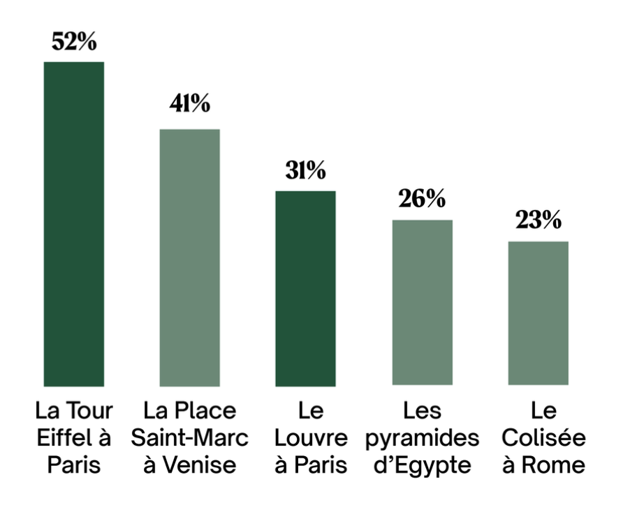 Plus concrètement, certains sites touristiques se distinguent aux yeux des Français par leur surfréquentation. Avec deux lieux particulièrement emblématiques, Paris apparaît comme la première victime de son succès. Pour 66% des personnes interrogées, il s’agit de la ville la plus touchée par le surtourisme, en premier lieu du fait de la Tour Eiffel (52%) puis du Louvre (31%). Elle est suivie par Venise et la place Saint-Marc (41%).