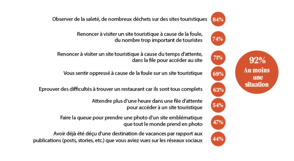 Si 41% des Français déclarent avoir subi le surtourisme (en particulier les couples avec enfants à 53%), ils sont encore plus nombreux (92%) à pointer du doigt au moins l’un de ses effets concrets : de la saleté ou des déchets observés sur des sites (84%), une foule trop importante (74%) ou le temps d’attente trop long (71%), …