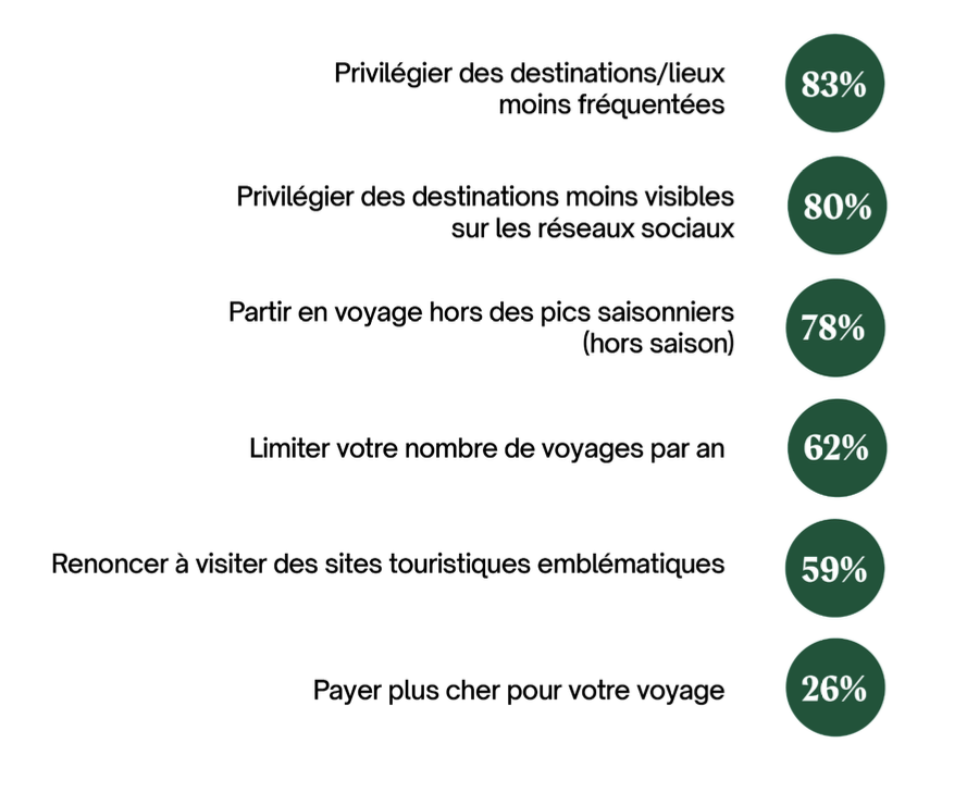 En revanche, s’ils sont prêts à faire des efforts, le prix reste le principal frein : seule une minorité de Français serait prête à payer plus cher pour son voyage (26%). Cette proportion s’élève néanmoins à 34% chez les voyageurs fréquents et à 54% pour ceux ayant le sentiment de contribuer au surtourisme.
