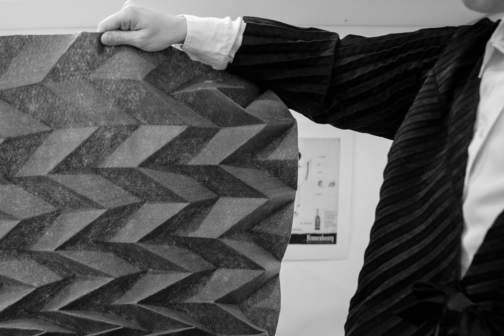 Le plissé acoustique est un axe d’innovation qui tient particulièrement à coeur à Sarah Saint-Pol, ancienne musicienne, et qui sera présenté officiellement lors de la prochaine édition du salon Maison & Objet. La créatrice fait également des recherches sur du cuir plissé pour pouvoir travailler avec des marques de maroquinerie, et du tyvek & pvc plissés à utiliser pour du packaging.